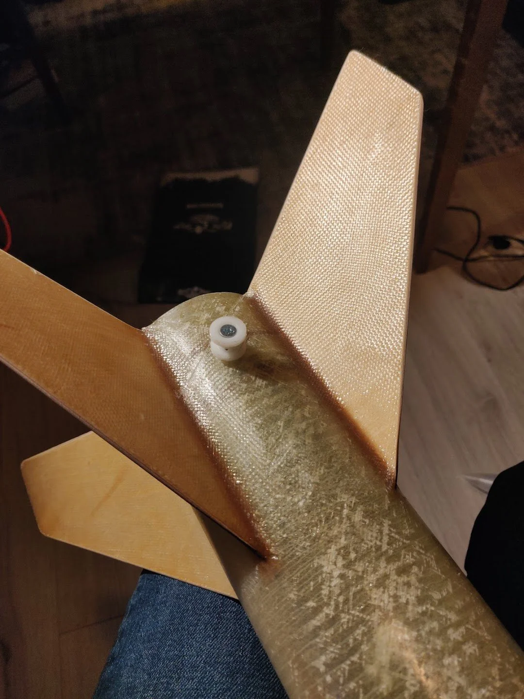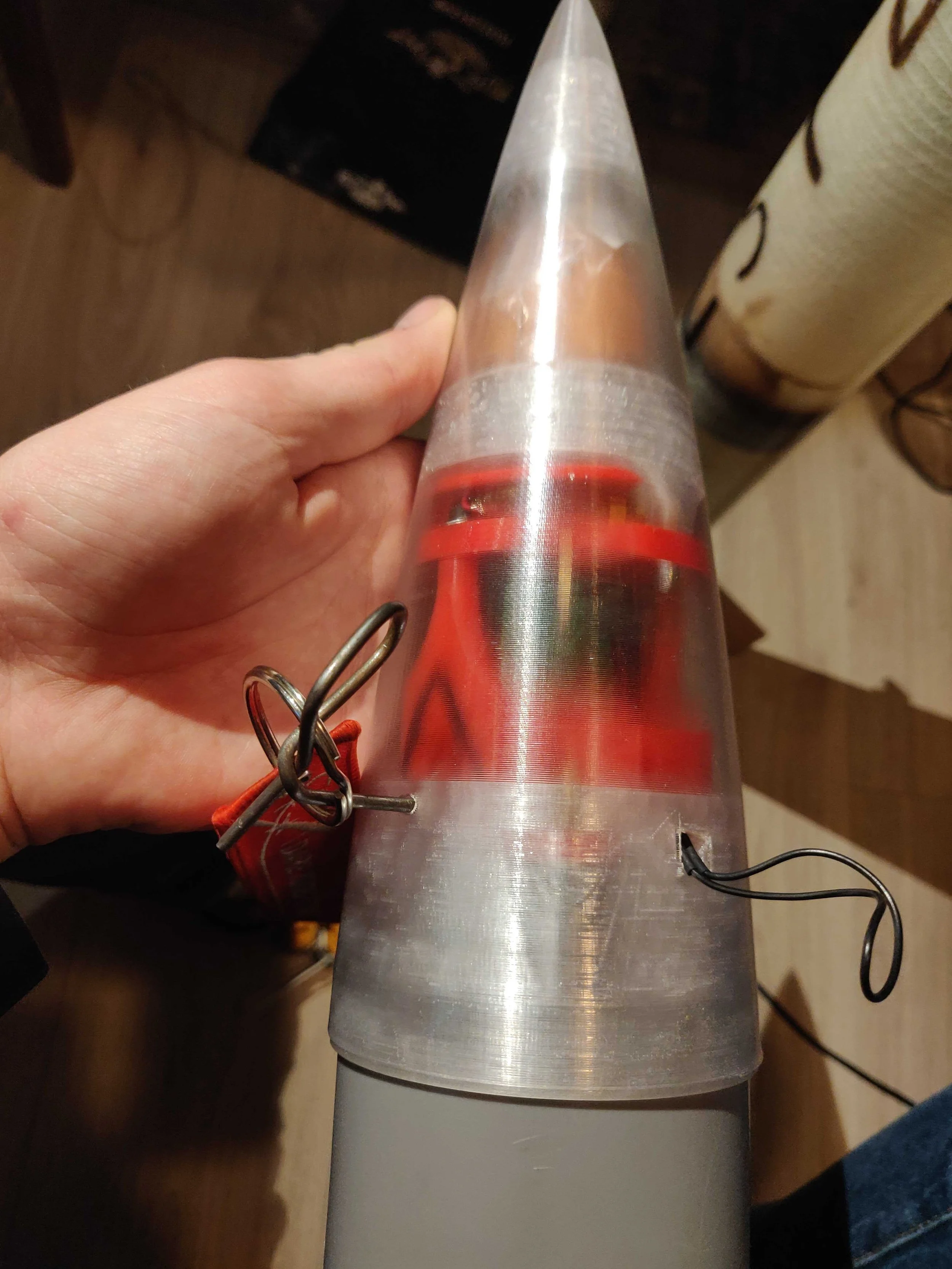 The large external parts are glued into the vase mode nose cone. (clear in the final iteration). The vase mode and internal bracing made for an extremely lightweight assembly that could house all the required electronics while being able to assemble and disassemble everything with 1 long hex key. An easy press fit piece of PVC was used to couple the nosecone assembly to the rocket body.